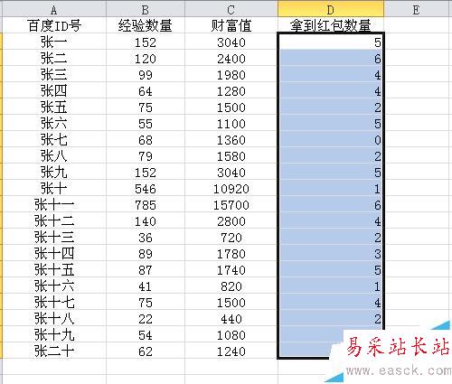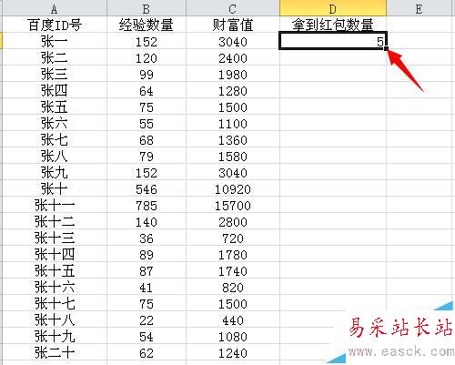 8、這時(shí)D列的D2顯示5,表示張一拿到5紅包,因?yàn)閯偛诺暮瘮?shù)公式是跟張一對(duì)應(yīng)的,所以出現(xiàn)了張一的數(shù)據(jù),如果想要其他人的數(shù)據(jù)時(shí),可以把鼠標(biāo)放到D2選項(xiàng)框的右下角,等到出現(xiàn)一個(gè)“+”號(hào)時(shí),雙擊鼠標(biāo)左鍵。(如下圖