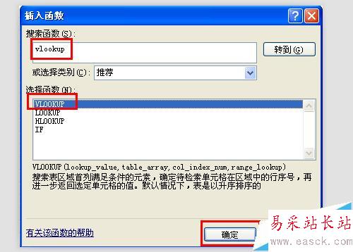 4、在插入函數(shù)窗口頁(yè)面,在搜索函數(shù)框中輸入”vlookup"然后轉(zhuǎn)到,在出現(xiàn)的結(jié)果函數(shù)中,點(diǎn)擊vlookup函數(shù),然后點(diǎn)確定。(如下圖)