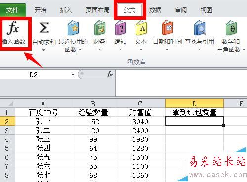 3、然后將鼠標(biāo)移動(dòng)到D列的第二行,打開(kāi)菜單欄的”公式“選項(xiàng),在公式的工具中找到”插入函數(shù)“并點(diǎn)擊。(如下圖)