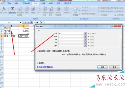 3、在彈出的對話框中,在Rate欄中,輸入的是B2,這個代表的意思是說這次貸款的年利率月多少,B2就是指3.5%,如圖所示。不過很多的情況下,如果是按月來還款的話就需要除以12,不過我們這里是按年來還款。