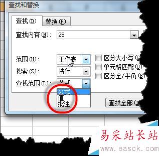 5、在“查找范圍”里,大家可以將查找范圍改成“值”。