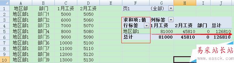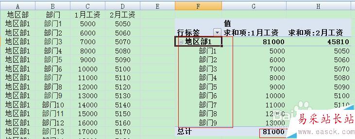 那么最終出現的結果如下截圖,那么仔細的朋友就會發現,使用了"多重合并計算數據區域"的不同點在于,地區部1沒有分開行,而是所有同樣的地區部1通過一行展示出來了,進行了求和。(當然求和這個值可以按需選擇,可以計數,求和等)