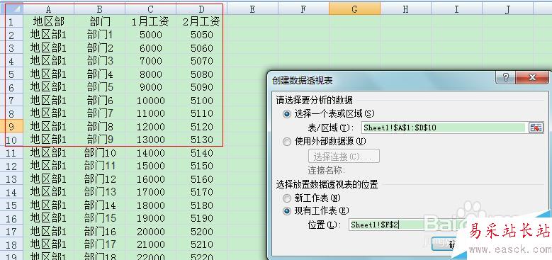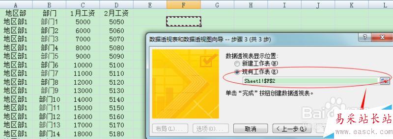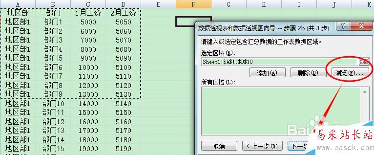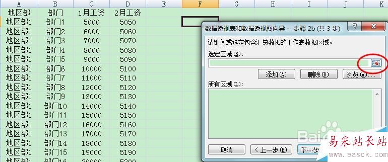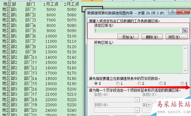 選擇自定義頁字段后,出現了如下界面。圈紅色的部分,一部分是選定區域,即我們要選擇透視的數據源,下面箭頭的數字0、1、2、3、4即我們要決定的第1頁透視哪些數據,第2頁透視哪些數據。當然并不是1代表sheet1,2代表sheet2,那么到底是什么呢?我用圖片展示給大家看,就明白了: