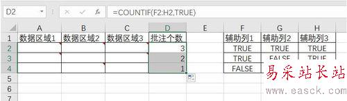 3、在D2單元格輸入以下公式,然后向下填充公式=COUNTIF(F2:H2,TRUE),統(tǒng)計(jì)出A:C列對(duì)應(yīng)行的批注個(gè)數(shù)