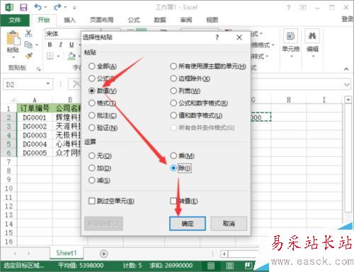 3、在彈出的選擇性粘貼對話框中,選擇“粘貼”為“數值(V)”,運算法則選擇“除”,然后再點擊“確定”按鈕。如圖所示;