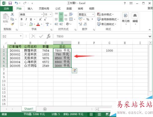 6、最后返回到工作表編輯窗口,可以看到D2:D6單元格區域里的數據變為了以千元為單位的。如圖所示;