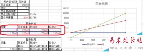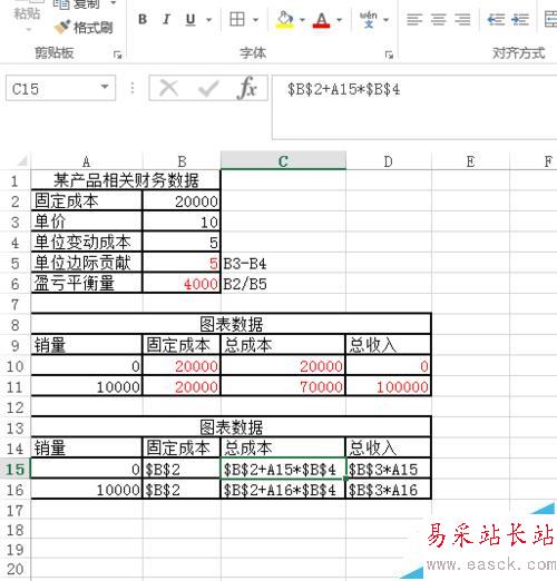 1、如圖所示,表格中紅色數字都要通過公式輸入。公式已標出。這樣處理是為了下面通過控件來使Excel盈虧平衡圖進行動態分析。