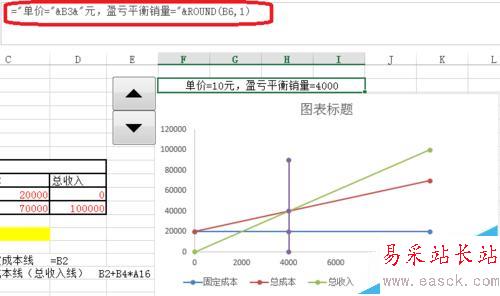 3、如圖所示輸入公式="單價="&B3&"元,盈虧平衡銷量="&ROUND(B6,1)。顯示當單價為多少時相應的盈虧平衡銷量。