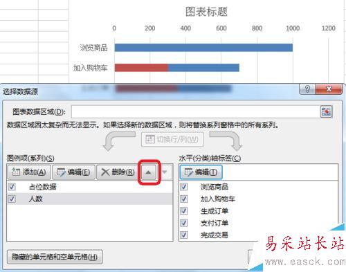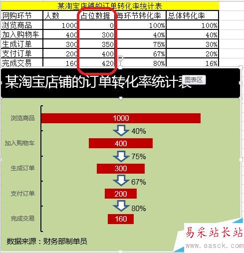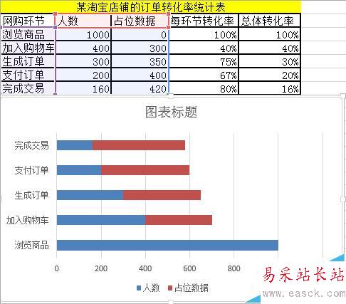 1、數據準備,如圖所示,添加如圖的占位數據。由于加入購物車——400放到中間,所以占位數據(1000-400)/2=300。由于生成訂單——300放到中間,所以占位數據(1000-300)/2=350。