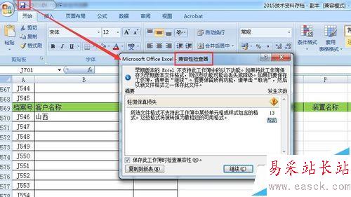 3、在這個工作表中,進行了內(nèi)容的修改后保存,結果總是彈出兼容檢查器的對話框,很麻煩看見這個頁面