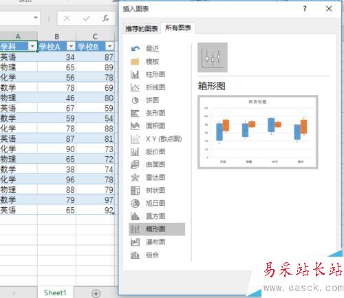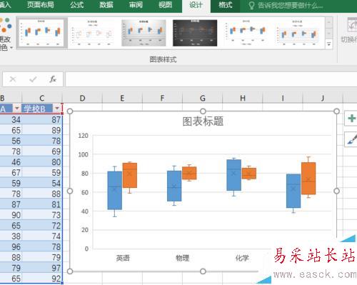 4、箱型圖即被插入到表格當中。其中,藍色的方塊是“學校 A ”的數據,橙色的方塊是“學校 B ”的數據。