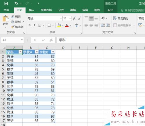 1、用 Excel 2016 打開一個數據表。在這里,我們以打開一個關于學習科目和學生成績的數據表為例。