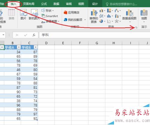 2、用鼠標點擊一下數據表內的任意一個單元格,然后先后點擊“插入”選項卡----“圖標”組右下角的小箭頭。