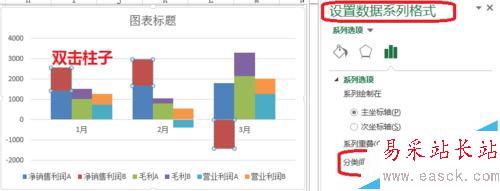 3、數(shù)據(jù)柱子——設(shè)置數(shù)據(jù)系列格式——分類間距(調(diào)整為0)。效果如圖所示。