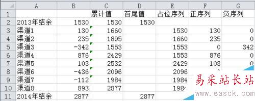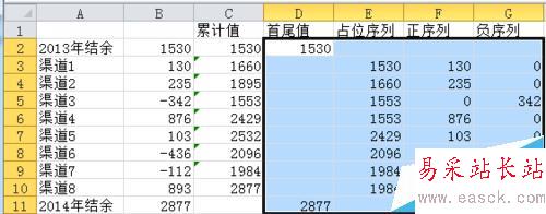 2、制作瀑布圖需要對這些原始數據進行處理,新增5個輔助列“累計值、首尾值、占位序列、正序列和負序列”,最終形成下圖所示的表格,處理過程如下: