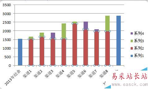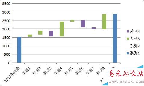 瀑布圖常用于表示起始時間和終止時間之間某一系列數據在各個流程中的變化過程,瀑布圖的好處就在于既能反映過程的變化量,又能反映每次變化的匯總結果,本例闡述瀑布圖的制作過程。