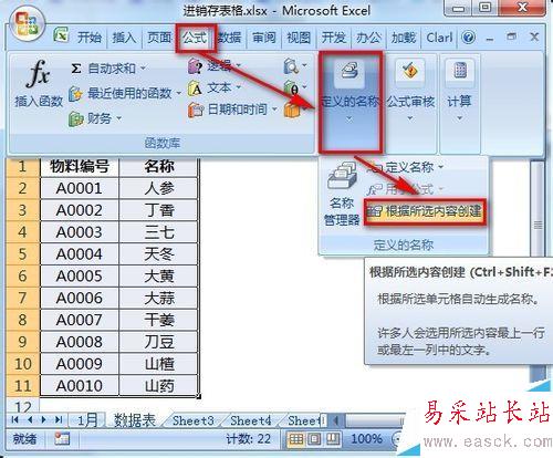 3、將【物料編號】和【名稱】定義成名稱,方便進銷存總表的數據錄入。選中【數據表】的A1:B11區域,點擊【公式】-【定義的名稱】-【根據所選內容創建】。