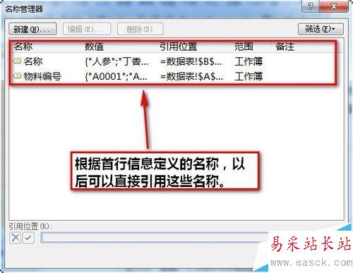 注意:運行的結果是將A2:A11的區域定義為“物料編號”這樣一個名稱,B2:B11的區域定義為“名稱”。Ctrl+F3可以查看定義的名稱。