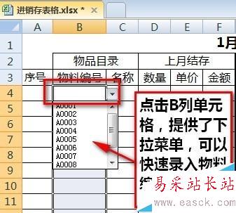 7、操作完成后,我們點擊B列的空白單元格提供的下拉菜單,就可以快速錄入物料編號了。