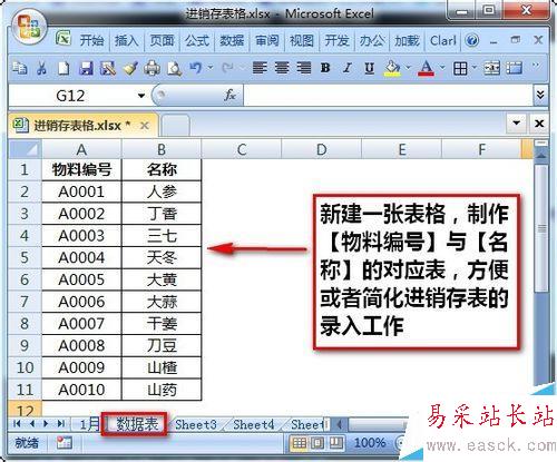2、新建一張表格,命名為“數據表”,用來存儲【物料編號】和【名稱】。