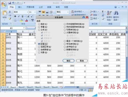 6、在打開的“定位條件”對話框中,選擇“空值”,然后單擊“確定”按鈕(如圖9所示)。