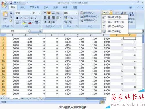 3、執(zhí)行“插入”→“插入工作表行”命令,這時便會從第三行開始,每一行的前面插入了一個空行(如圖5和圖6)。
