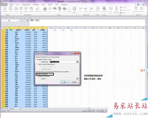 2、打開創建數據透視表對話框,選擇把數據透視表放到新的工作表里---確定