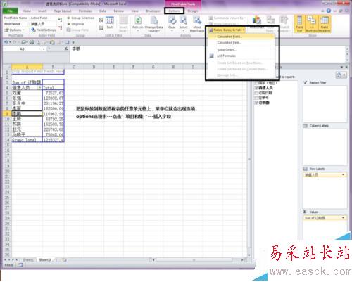 4、把鼠標放到數據透視表的任意一個單元格上,菜單欄就會出現選項options選項卡---點擊“項目和集”---“插入計算字段”