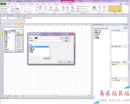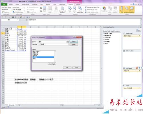 3、勾選字段“銷售人員”和“訂購額”,得到如下結果。我們需要在這個數據透視表里添加“提成”字段,提成按訂購額的百分之二來算。