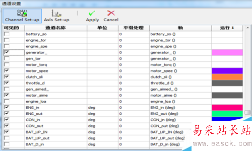 4.在通道設置里面勾選想要顯示的信號,并為各個不同信號設置不同的顏色以示區分。同時還可以對各個信號的坐標軸進行設置。點擊“Apply”后,信號的顯示效果如下圖所示。