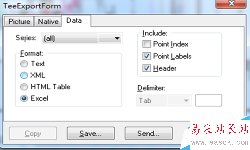 5.單擊上部菜單中的“主圖”命令,依次選擇“數據導出”—“圖形”命令,會彈出“TeeExportForm”對話框,選擇“Data”選項,選擇導出格式為“Excel“,如下圖所示。