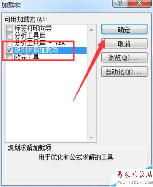 4、在轉到“加載宏”的對話窗口中,勾選“規劃求解加載項”,之后再點擊“確定”按鈕。如圖所示;
