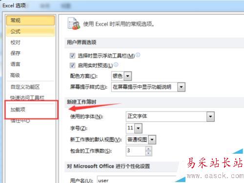 2、在打開的“excel選項”對話窗口中,選擇左側窗口的“加載項”點擊它。如圖所示;