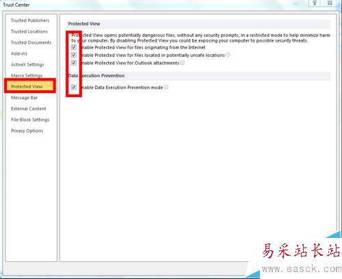 4、出現“信任中心”界面,點擊“Protected View”,將右邊所有的對號全部去掉,點擊保存