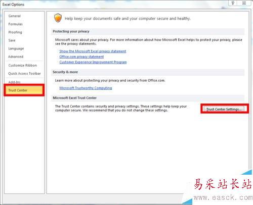 3、出現“選項”窗口,點擊“信任中心”,然后點擊“信任中心設置”