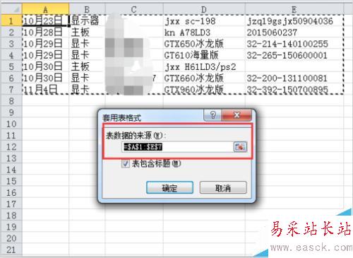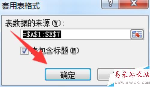 4、在彈出的“套用表格式”,Excel2010自動會選中表格的范圍。如圖所示;