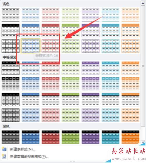 3、在彈出的選項框中,選擇我們需要的表格樣式,例如:表樣式淺色16。如圖所示;