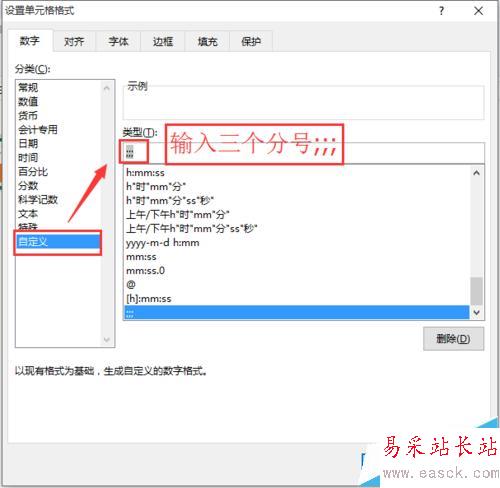 依舊選中要隱藏的單元格,選中之后在該區域點擊鼠標右鍵,并在彈出的菜單列表中,找到“設置單元格格式”。彈出“設置單元格格式”窗口,在“數字”選項卡中,點擊“自定義”,并在右側的類型文本框中輸入三個分號(英文狀態下);;;,點擊確定即可。