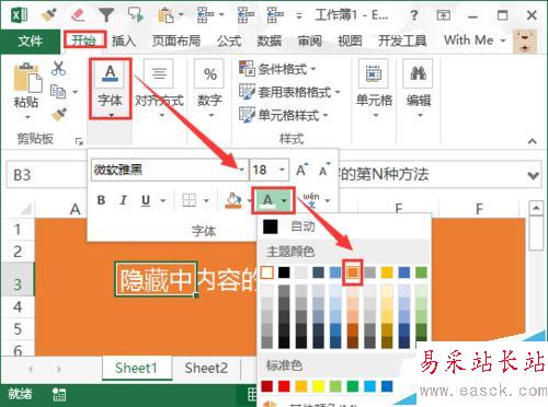 選中要隱藏的內容所在的單元格,在Excel頂部的菜單欄中,點擊“開始”選項卡,在“字體”欄目下,點擊“字體顏色(A)”旁邊的黑色下拉小三角,再彈出的顏色區塊中,選擇為橙色。這樣字體則和背景色融為一體,達到顯示效果的上的隱藏。