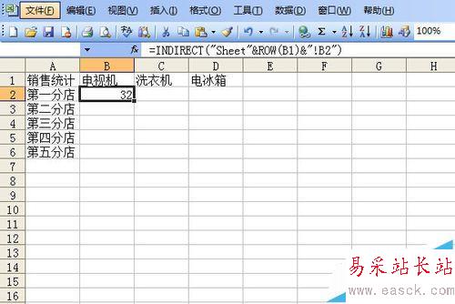 4、調(diào)用函數(shù)進(jìn)行匯總。單擊B2單元格,輸入公式=INDIRECT("Sheet"&ROW(B1)&"!B2"),這個(gè)函數(shù)里嵌套一個(gè)行號(hào)函數(shù)ROW,"Sheet"&ROW(B1)相當(dāng)于Sheet1,,括號(hào)內(nèi)的字符串表示引用第一張工作表的B2單元格數(shù)據(jù)。輸入好公式后按回車鍵確定。這時(shí)顯示數(shù)據(jù)32。注意ROW(B1)=1。