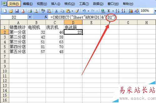 5、用填充柄向下復(fù)制公式,可以看到第二行的公式是=INDIRECT("Sheet"&ROW(B2)&"!B2"),就是說,在目標(biāo)處,放入第二張表格的B2單元格數(shù)據(jù),依此類推。注意ROW(B2)=2。