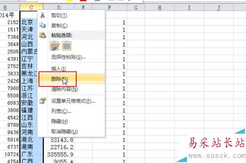 7、最后的判斷列的結果是都是1,說明左右的數據是對應的,我們可以放心的刪除C列的數據,在C列右擊,選擇“刪除”