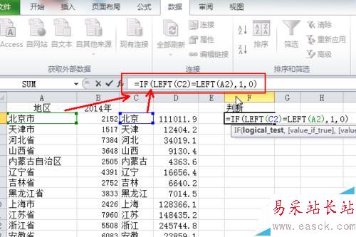 6、導入數據以后我們發現第一列和第三列的地區名重復了,但是無法確定數據是否左右一一對應,在F2單元格輸入=IF(LEFT(A2)=LEFT(C2),1,0)如果左右對應的話,返回1,否則顯示0