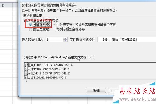 3、這時會出現導入過程的對話框,首先選擇分割符號,excel通過對txt里面的符號識別劃分字段