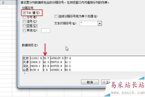4、接下來這一步我們選擇Tab鍵,注意下方的字段劃分情況,只有選擇對了劃分的標準我們才能將這些字段成功導入,如果有些字段不容易分開,我們可以先保留,等數據進入表格以后,再處理