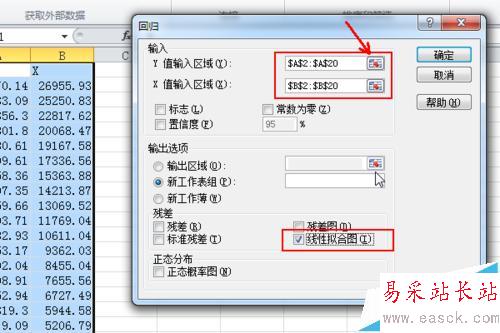 4、點擊Y值輸入區域后面的單元格選擇工具,選擇Y值單元格,比如小編這里的A2:A20,X值同理操作,這里選擇B2:B20,勾選下方的線性擬合圖,我們可以看一下擬合的效果