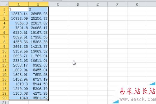 1、首先要準備好兩組數據做為x和y,這組數據在可以簡單感覺一下是否具有線性關系。將準備好的數據放入excel表格里面