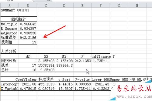 5、excel會在新的工作表里面輸出回歸分析的相關結果,比如相關系數R^2,標準誤差,在X-variable和Intercept兩項的值可以寫出一元回歸方程