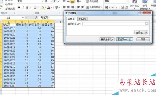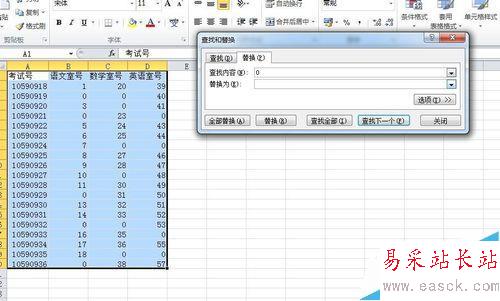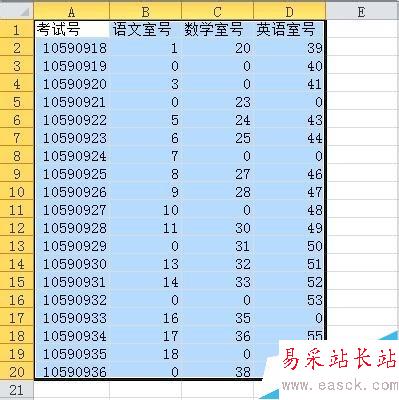 1、首先我們先看下原始的表格,這個表格是學號和考慮的課室的統計表,零代表是沒有參加考試,但是因為是顯示零所以看起來不明顯,下面我就介紹一下怎樣可以把沒有考試的課室變成空值
