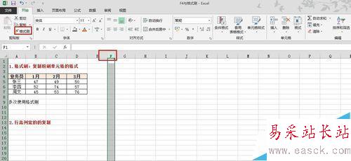 4、 用格式刷對行高列寬進(jìn)行復(fù)制:我首先選擇已經(jīng)設(shè)置好的列寬的F列,然后雙擊格式刷,最后再點(diǎn)擊我要設(shè)置的其他列,這里點(diǎn)擊后的列都變得與F列等寬了。